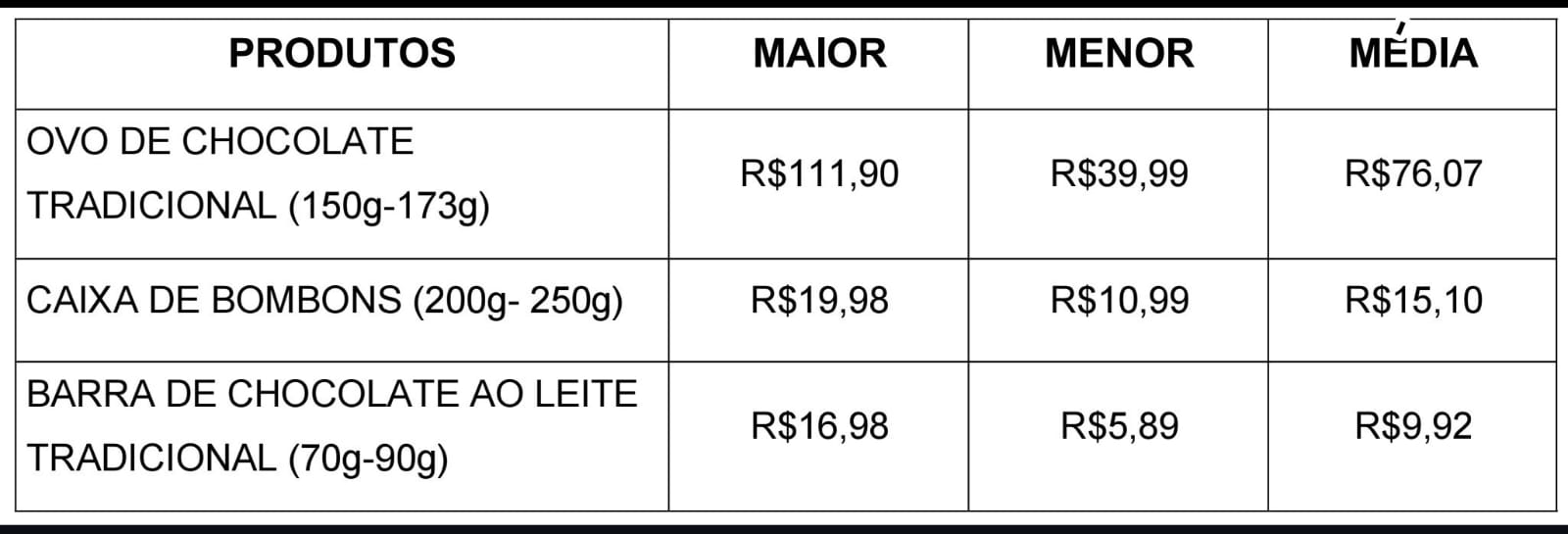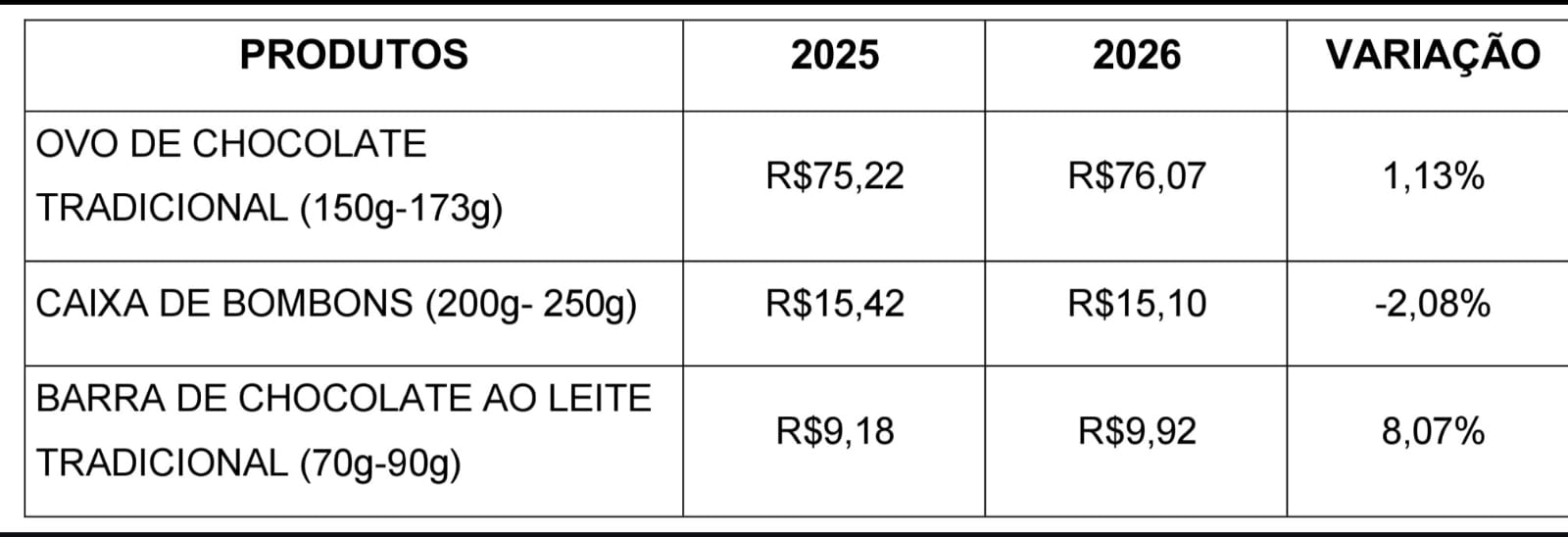 A 13 dias do domingo de Páscoa, 5 de abril, servidores do Procon Pelotas procederam ao levantamento dos preços mais altos, mínimos e médios dos produtos de chocolate, em macro e supermercados da cidade. Ao pesquisar as médias dos valores e confrontá-las com as de 2025, a equipe encontrou as variações, para mais, de 1,13% do ovo – com pesos entre 150 e 173 gramas – e de 8,07% da barra, ambos "ao leite tradicional".